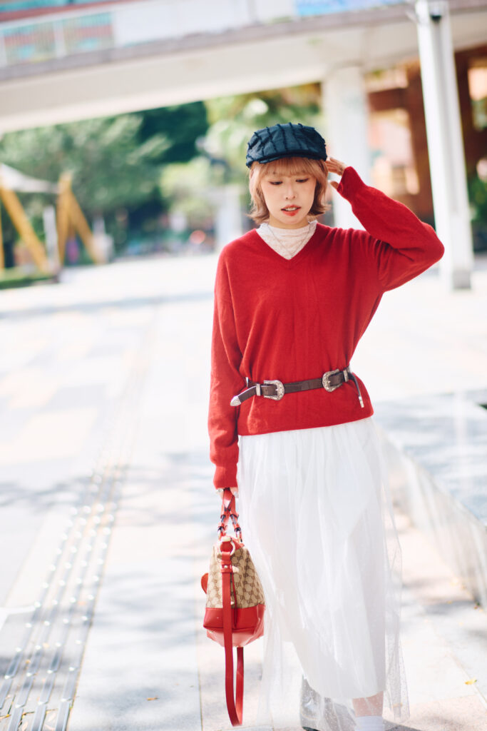 紅色搭配白色一直都是非常經典的組合,上身選擇白色針織單品,讓整體視覺更清爽,也能中和大紅色的強烈,讓造型看起來有過年氛圍,卻依然保有日常感。
