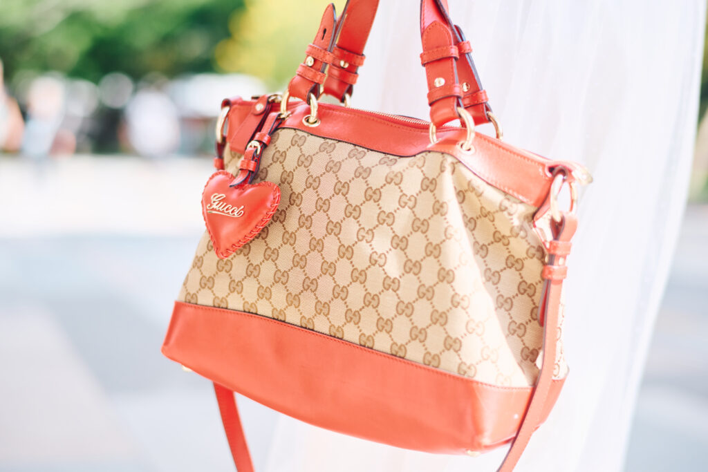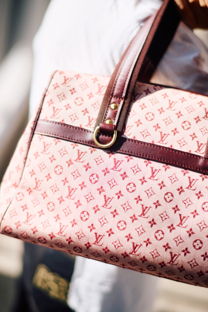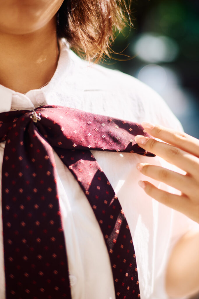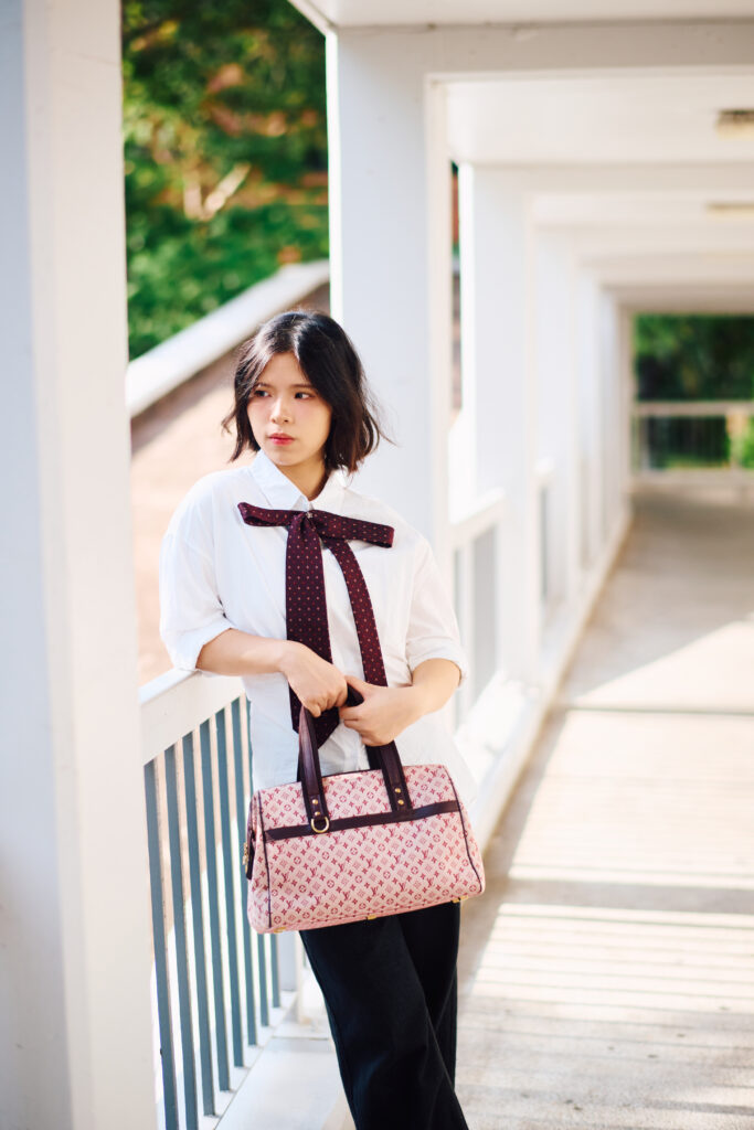 偏暗紅色調的 LV 手提包,搭配同色系的領帶,稍微DIY成蝴蝶結造型增添可愛感。整體色系沈穩,保有慶祝節日的儀式感,也兼顧日常實用性,即使其他日子佩戴都完全不突兀!